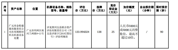 项目名称: 广元市金轮建筑有限责任公司在用周转材料及机器设备处置 项目编号: GR2018SC1000928 挂牌价格(万元): 138 首次挂牌公告期: 10个工作日 首次挂牌起始日期: 2018-08-03 挂牌截止日期: 2018-08-16 资产概况: 一、转让方承诺 一、转让方承诺 本转让方拟转让持有标的企业产权,并委托交易机构公开披露产权转让信息和组织交易活动。依照公开、公平、公正、诚信的原则作如下承诺: 1、本次产权转让是我方真实意愿表示,转让的产权权属清晰,我方对该产权拥有完全的处置权且实施不存在任何限制条件; 2、我方转让产权的相关行为已履行了相应程序,经过有效的内部决策,并获得相应批准; 3、我方所提交的《信息发布申请书》及附件材料内容真实、完整、合法、有效,不存在虚假记载、误导性陈述或重大遗漏; 4、我方在转让过程中,遵守法律法规规定和产权交易市场的相关规则,按照有关要求履行我方义务。 我方保证遵守以上承诺,如违反上述承诺或有违规行为,给交易相关方造成损失的,我方愿意承担法律责任及相应的经济赔偿责任。 二、其他事项 1.本网站项目信息同步在西南联合产权交易所官网(www.swuee.com)展示; 2.本网站披露的与竞价相关的“最小加价幅度”、“保留价”等参数,西南联合产权交易所有权按实际情况进行调整。 二、转让方简况 转让方基本