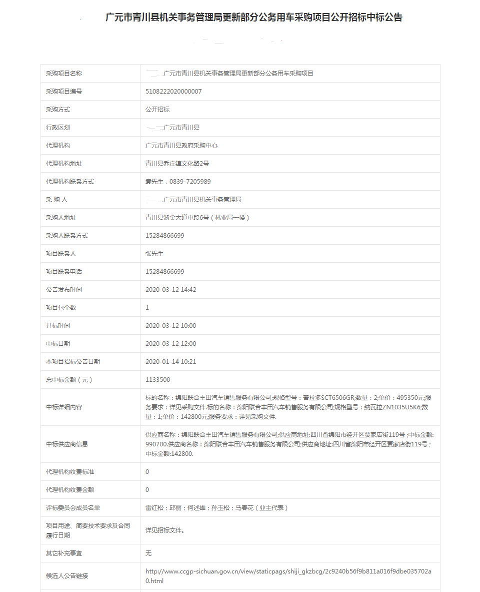 青川县机关事务管理局更新部分公务用车采购项目中标公告