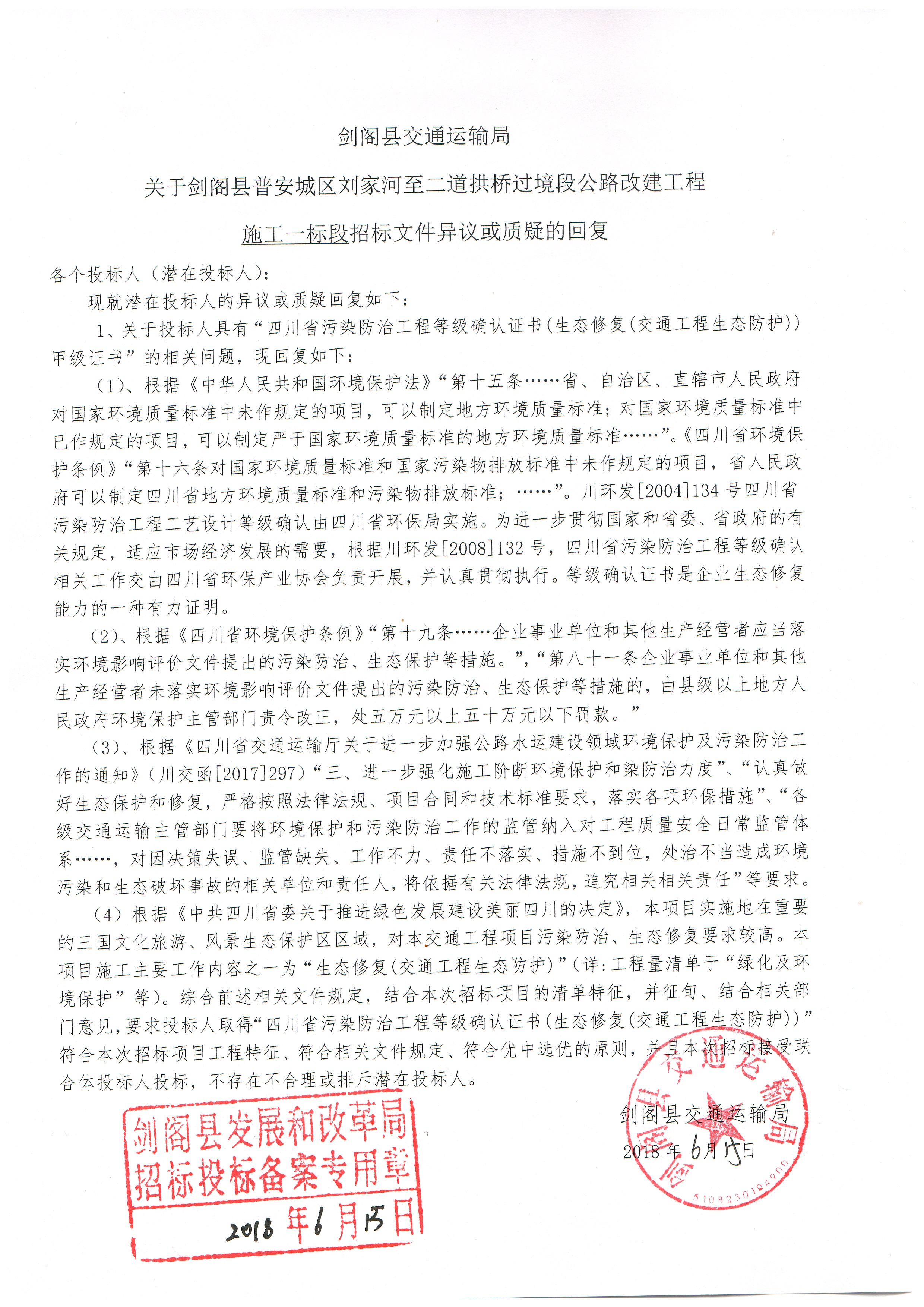 1、关于投标人具有“四川省污染防治工程等级确认证书(生态修复(交通工程生态防护))甲级证书”的相关问题,现回复如下:
