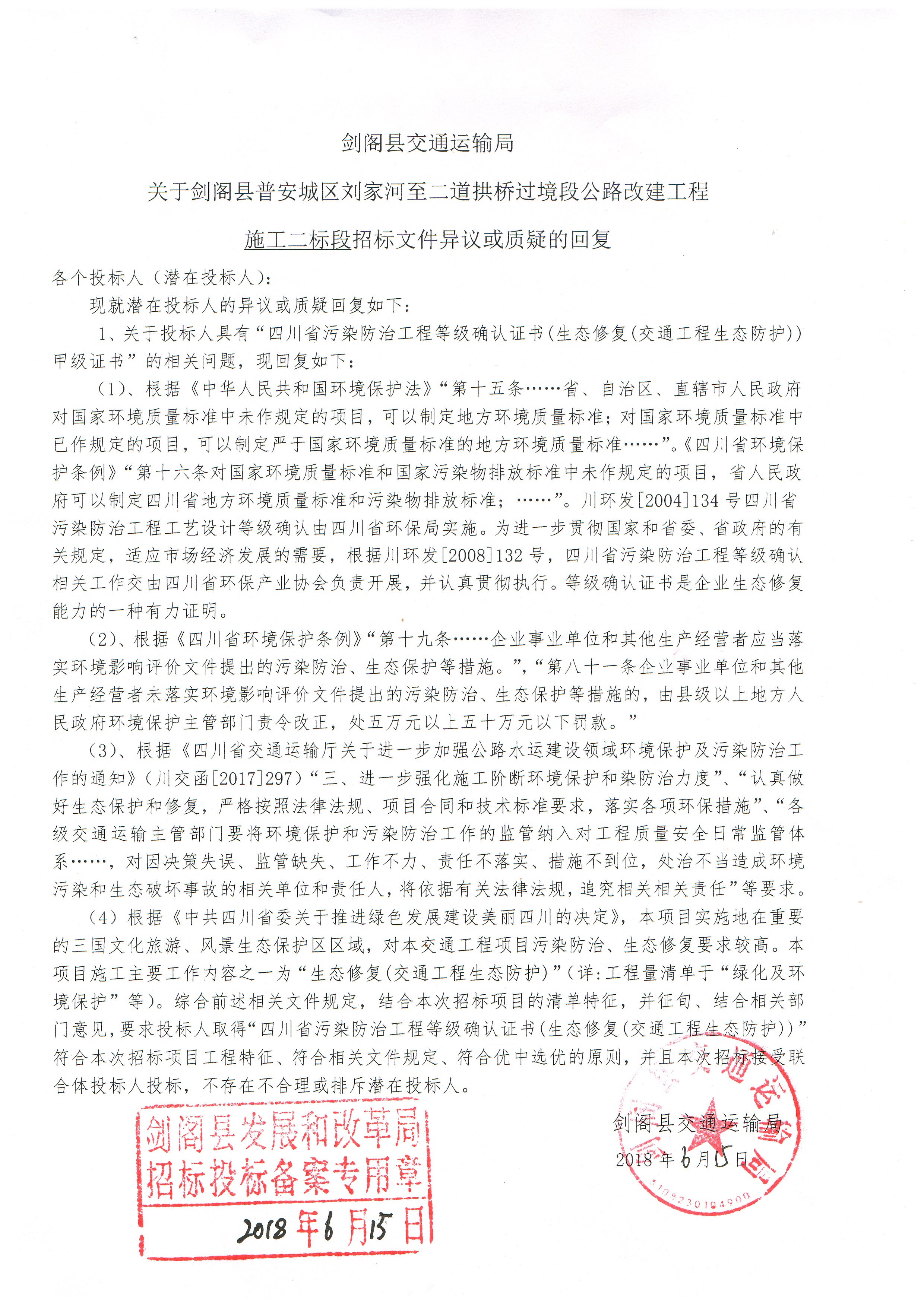 1、关于投标人具有“四川省污染防治工程等级确认证书(生态修复(交通工程生态防护))甲级证书”的相关问题,现回复如下: